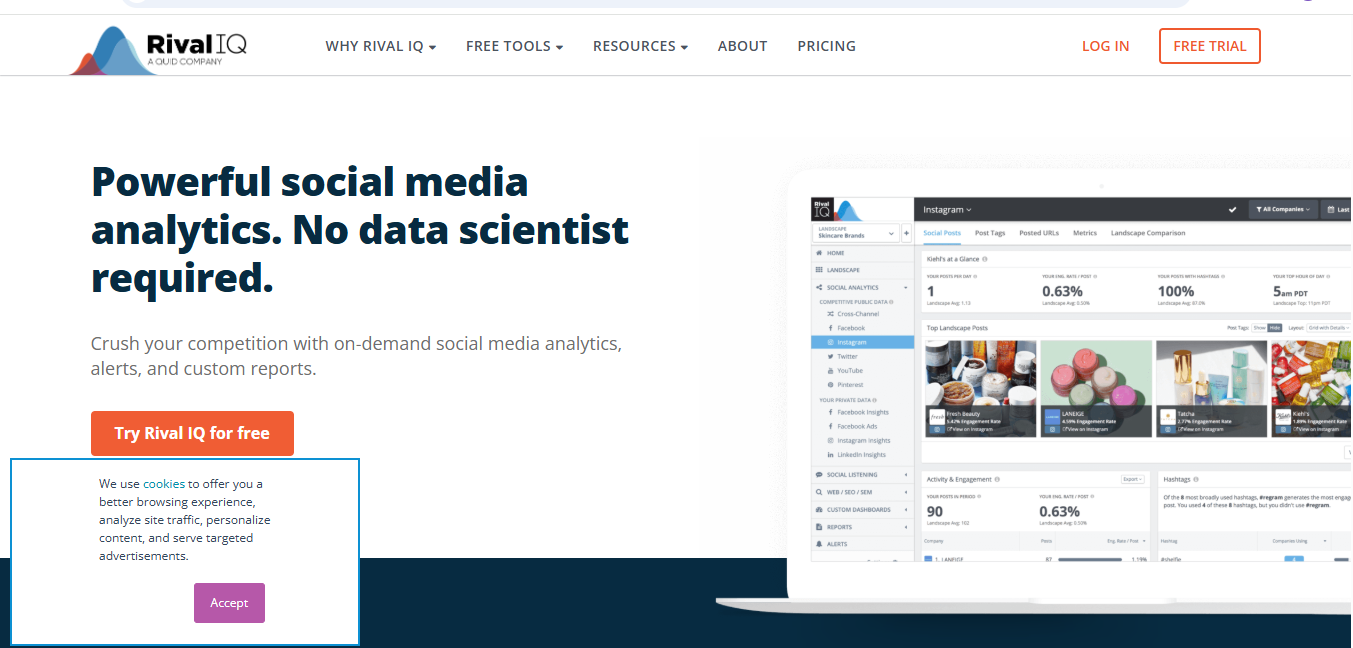 Rival IQ – $239/month for advanced competitor benchmarking and multi-platform analytics.