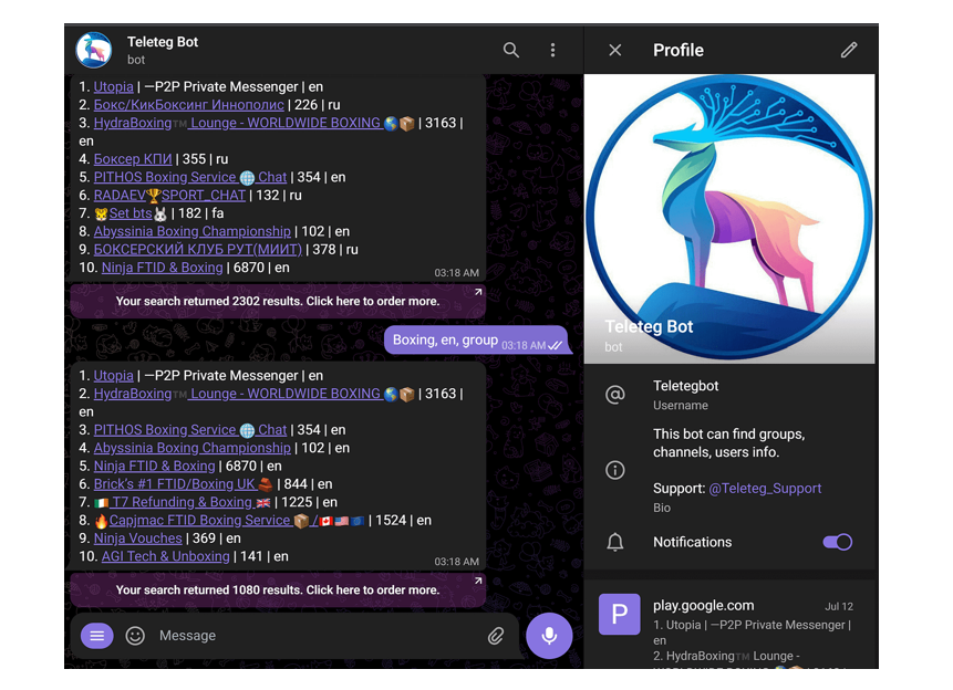 Once you start a bot, you simply type in what you’re looking for, and it will generate a list of groups or channels that fit your query. Some bots even allow advanced customization, like showing only active groups or filtering by language.