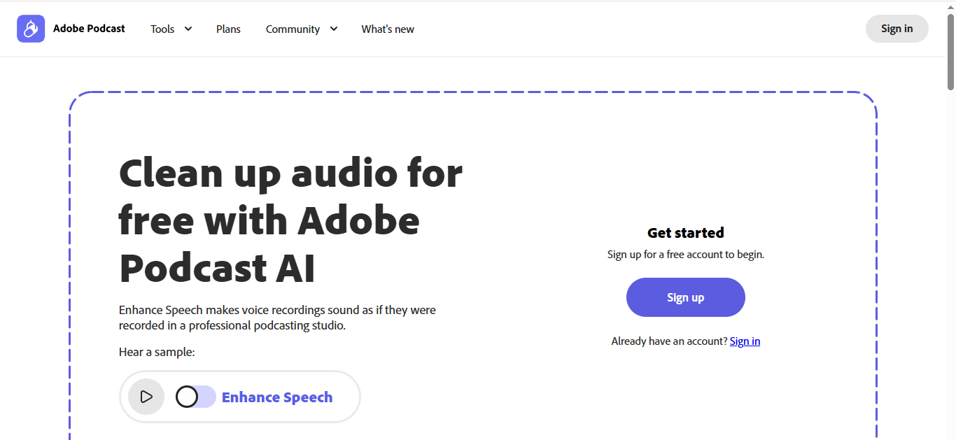 Adobe Podcast AI is a browser‑based AI audio enhancement and editing platform designed especially for podcasters and spoken‑word creators. It lets you record, transcribe, and clean up your audio with AI tools that make recordings sound more professional, even if your original audio was recorded in a less‑than‑ideal environment. As a web‑app, there’s no software to install — you log in and start improving audio right away.