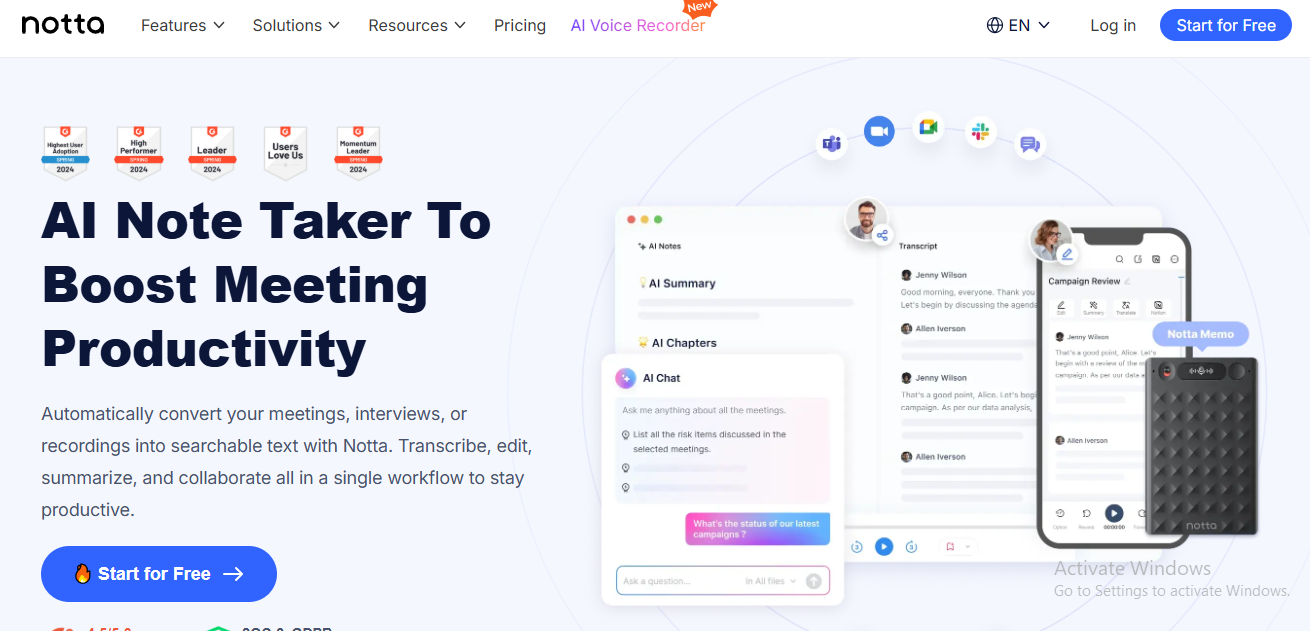 Designed for both individuals and teams, Notta is trusted by over 5 million users worldwide, including professionals from global organizations like Salesforce, Coca-Cola, and PwC. With strong security measures in place—such as SOC-2 certification and GDPR compliance—Notta provides a secure, all-in-one solution for transcription, translation, and meeting documentation.