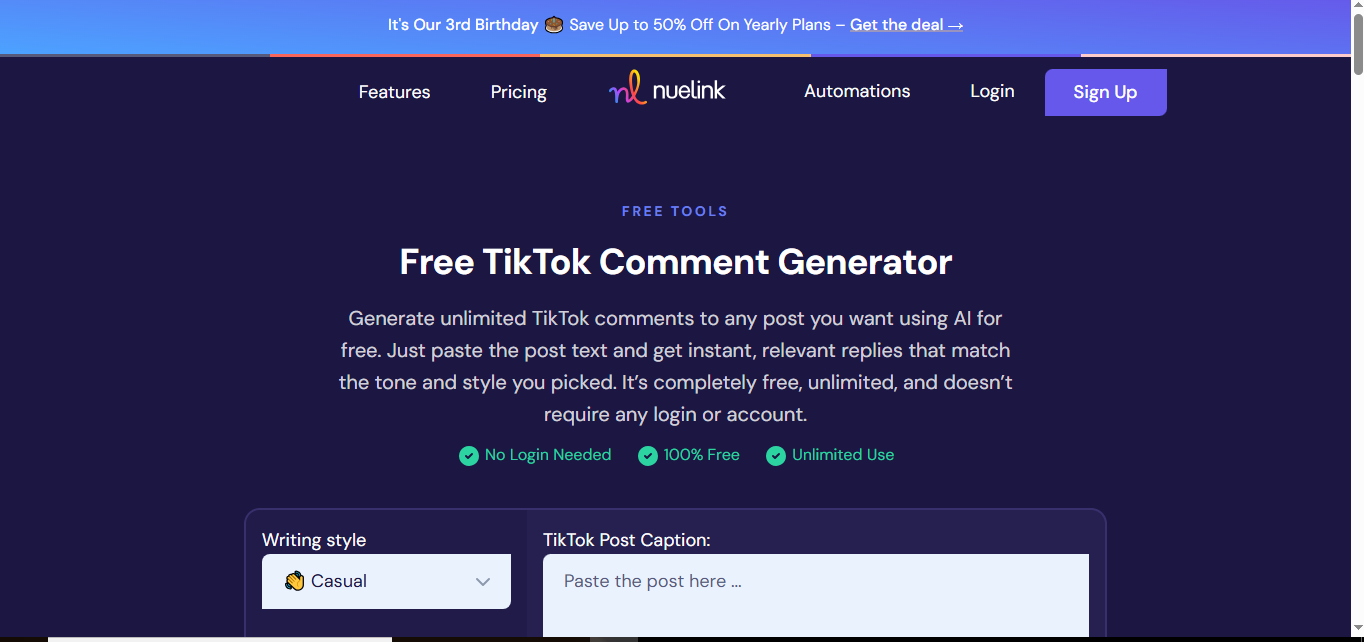 - Nuelink TikTok Comment Generator – Best for unlimited comment generation