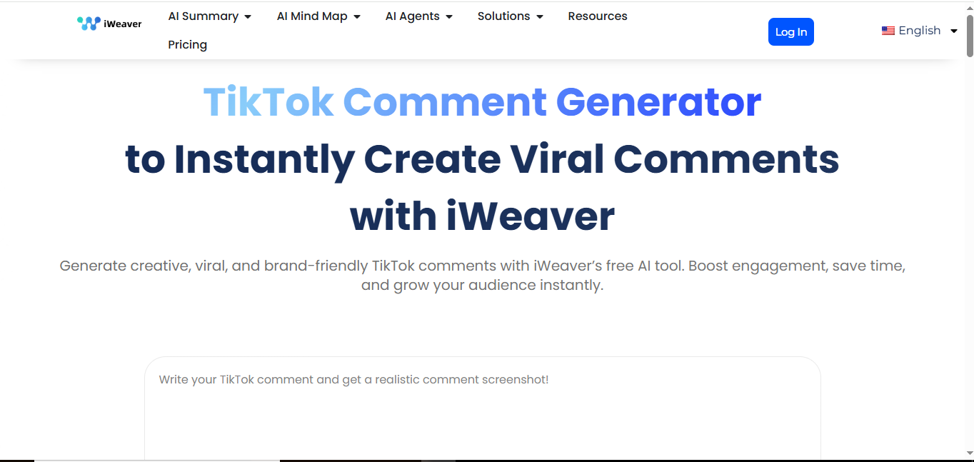 iWeaver TikTok Comment Generator is an AI-powered tool built to help brands and creators generate creative, viral, and brand-consistent comments. It focuses on producing comments that align with your account’s tone and voice, making it easier to maintain a professional and engaging presence on TikTok.